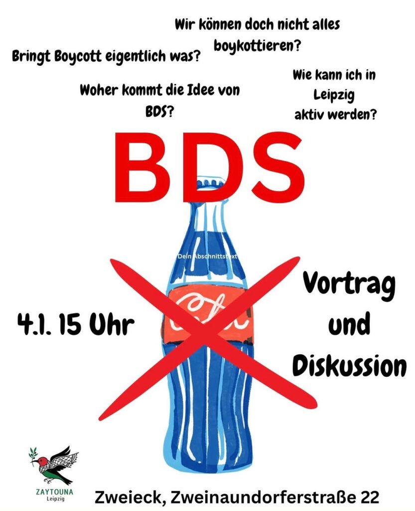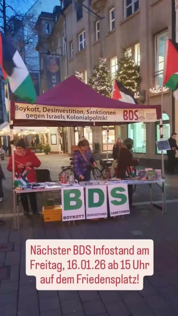 Inspiriert vom Kampf der Südafrikaner*innen gegen Apartheid ruft die palästinensische Zivilgesellschaft zu Boykott, Desinvestitionen und Sanktionen gegen Israel auf, bis dieses internationalem Recht und den universellen Prinzipien der Menschenrechte nachkommt. BDS-Kampagne informiert über bundesweite und globale Aktivitäten im Rahmen der internationalen BDS Bewegung, die den Aufruf der palästinensischen Zivilgesellschaft von 2005 unterstützt.