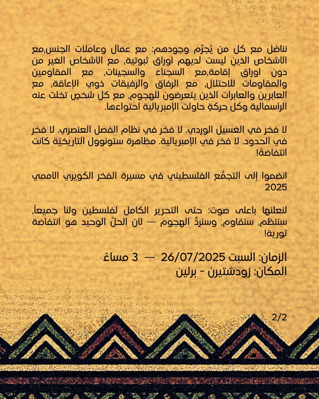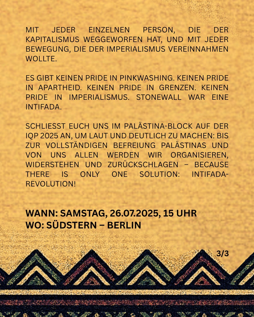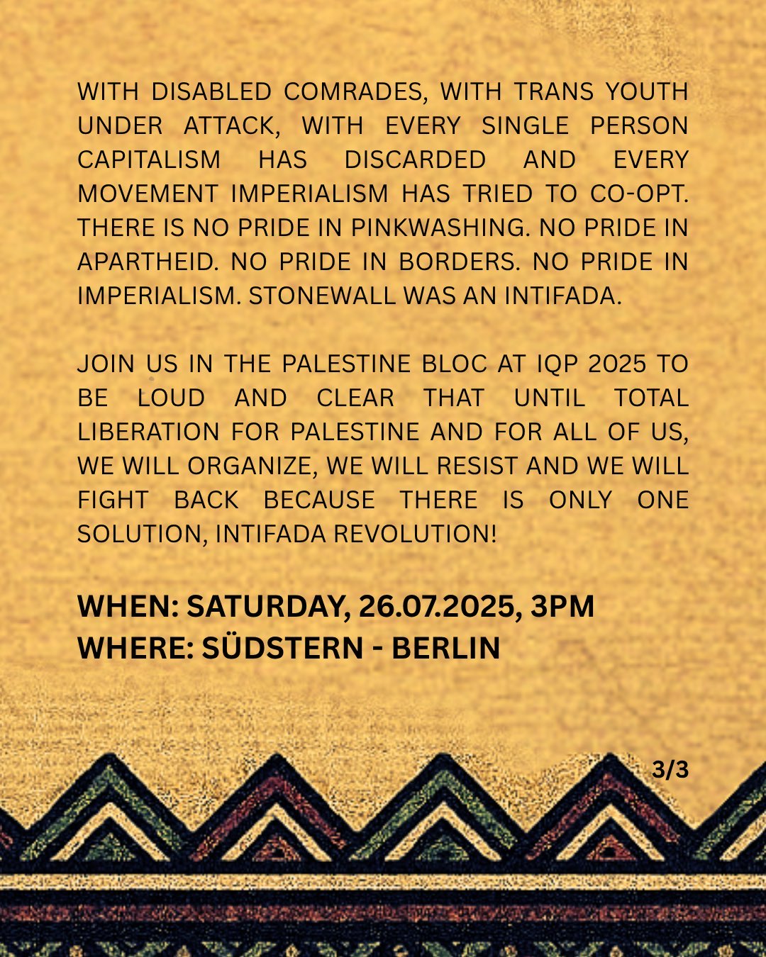 IQPB / Pinkwashing / LGBTQIA+ AUFRUF ZUM PALÄSTINA-BLOC AUF DER INTERNATIONALISTISCHEN QUEER PRIDE 2025 21. Juli 2025 Twittern