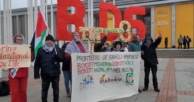 BDS Aktivist*innen und Unterstützer-*innen standen heute zur Eröffnung der diesjährigen Fruit Logistica, der weltweit größten Messe für Obst und Gemüse, vor dem Haupteingang der Messe Berlin und wiesen mit Transparent und Flugblättern (Deutsch / Englisch) darauf hin, dass das von Israel in alle Welt exportierte Obst und Gemüse überwiegend auf Land angebaut wird, das unrechtmäßig enteignet wurde (Veranstaltungshinweis auf Facebook).