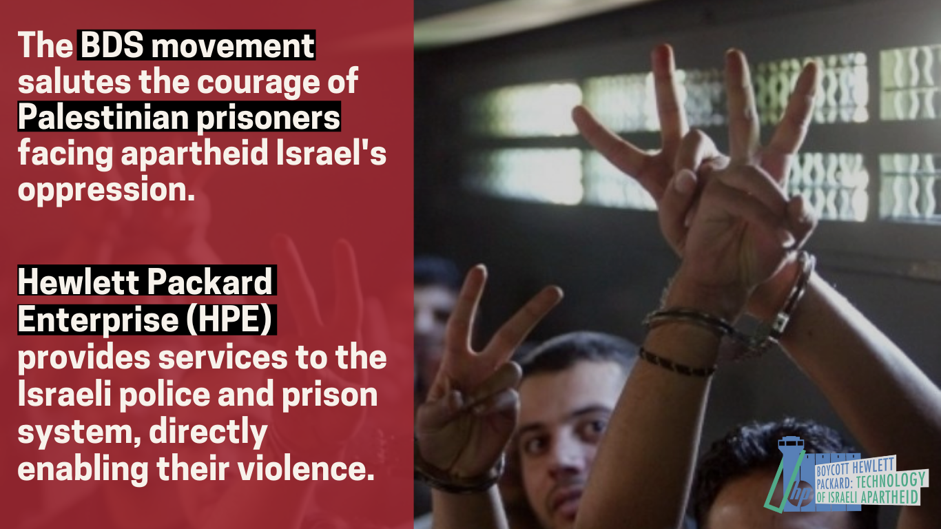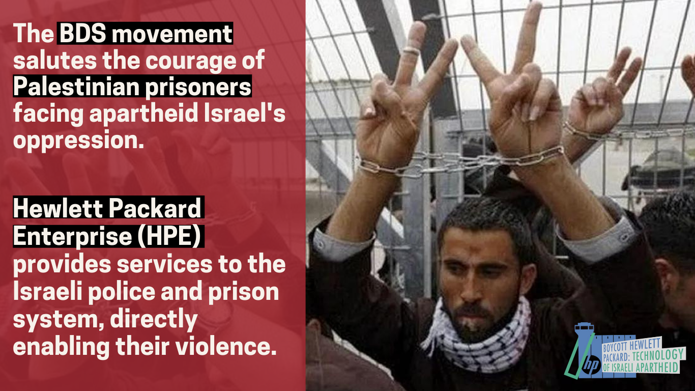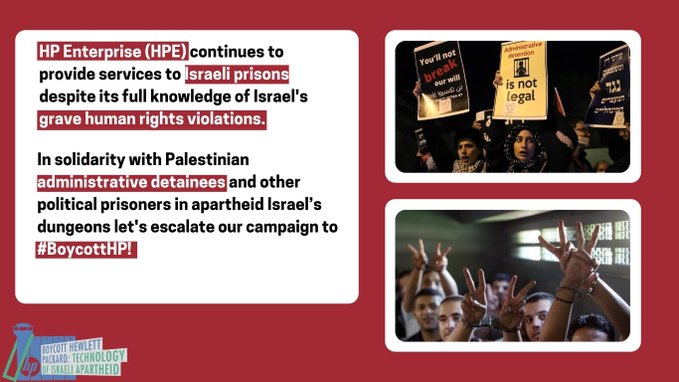 HP Enterprise (HPE) erbringt weiterhin Dienstleistungen für die israelischen Apartheid-Gefängnisse und die Polizei, obwohl das Unternehmen von den schweren Menschenrechtsverletzungen, einschließlich Folter, weiß, die von beiden begangen werden. Dies bedeutet, dass HP weiterhin am israelischen Apartheidsregime beteiligt ist und die Unterdrückung palästinensischer Gefangener direkt unterstützt.