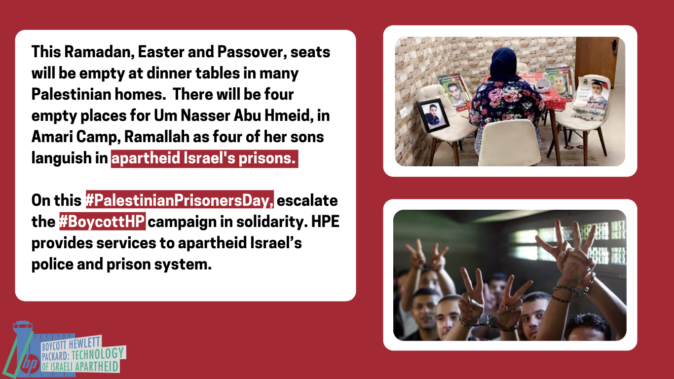 Twittern wir am 17. April – dem Tag der palästinensischen Gefangenen – rund um den Globus und intensivieren wir unsere #BoycottHP-Kampagne in Solidarität mit den palästinensischen Gefangenen!