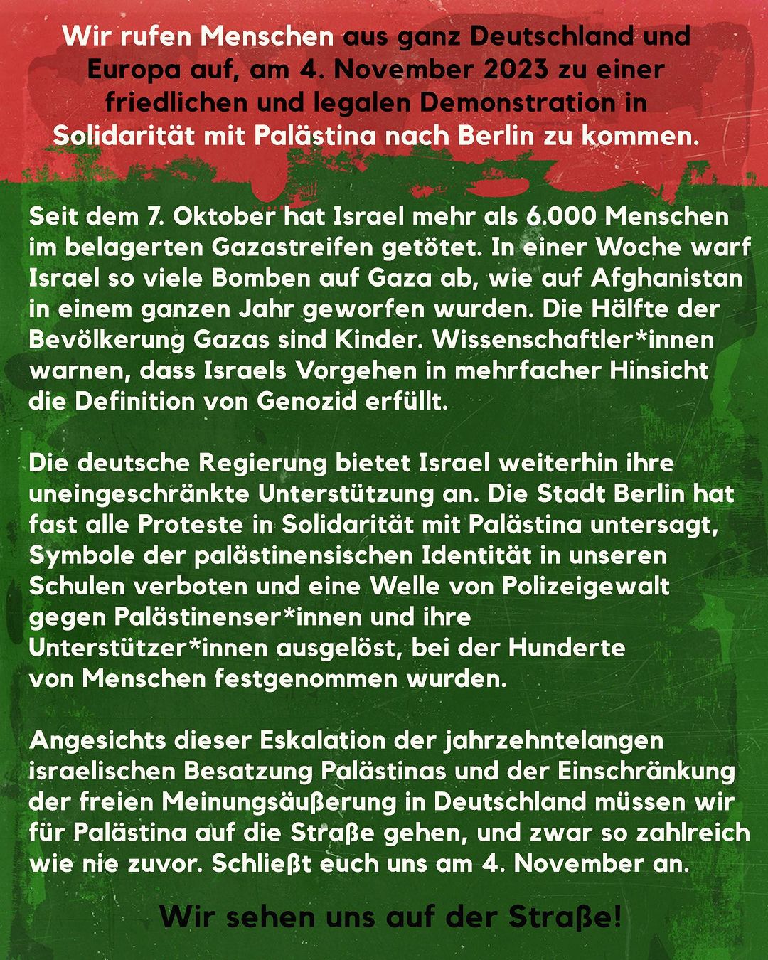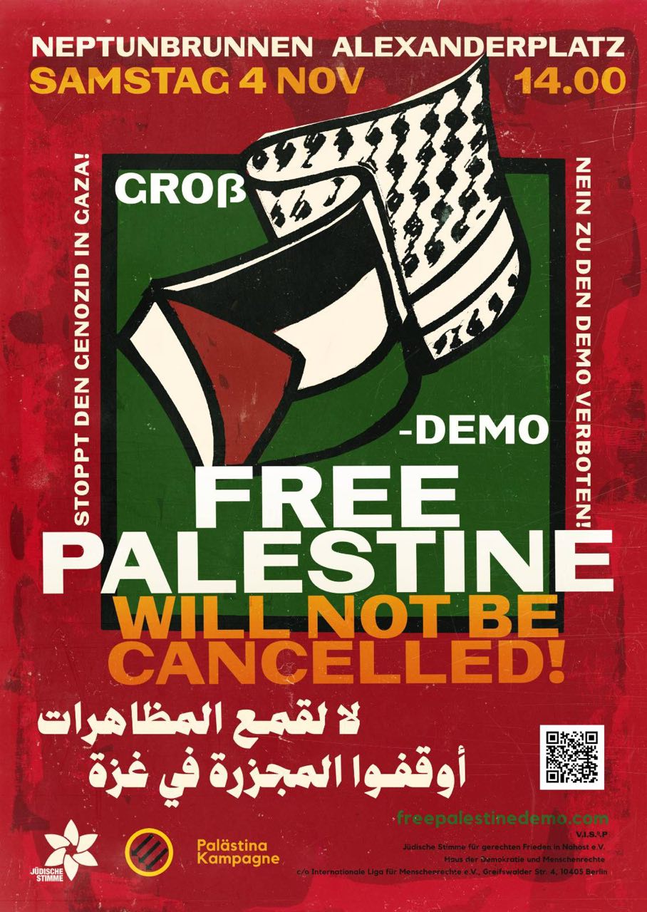Wir rufen Menschen aus ganz Deutschland und Europa auf, am 4. November 2023 zu einer friedlichen und legalen Demonstration in Solidarität mit Palästina nach Berlin zu kommen.Seit dem 7. Oktober hat Israel mehr als 5.000 Menschen im belagerten Gazastreifen getötet. In einer Woche warf Israel so viele Bomben auf Gaza ab, wie auf Afghanistan in einem ganzen Jahr geworfen wurden. Die Hälfte der Bevölkerung Gazas sind Kinder. Wissenschaftler*innen warnen, dass Israels Vorgehen in mehrfacher Hinsicht die Definition von Genozid erfüllt.Die deutsche Regierung bietet Israel weiterhin ihre uneingeschränkte Unterstützung an. Die Stadt Berlin hat fast alle Proteste in Solidarität mit Palästina untersagt, Symbole der palästinensischen Identität in unseren Schulen verboten und eine Welle von Polizeigewalt gegen Palästinenser*innen und ihre Unterstützer*innen ausgelöst, bei der Hunderte von Menschen festgenommen wurden.Angesichts dieser Eskalation der jahrzehntelangen israelischen Besatzung Palästinas und der Einschränkung der freien Meinungsäußerung in Deutschland müssen wir für Palästina auf die Straße gehen, und zwar so zahlreich wie nie zuvor. Schließt euch uns am 4. November an. Wir sehen uns auf der Straße!