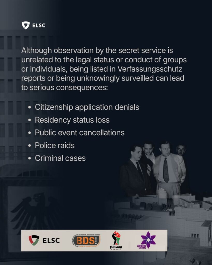 Reports by the domestic intelligence services, or being surveilled unknowingly, can lead to the cancellation of public events or have severe consequences on people’s citizenship applications, freedom of movement, and residency status. Observation by intelligence services is unrelated to the legal status or legal conduct of a group or individuals, but being listed further delegitimises Palestine solidarity groups, isolating them and hindering support to their mission.