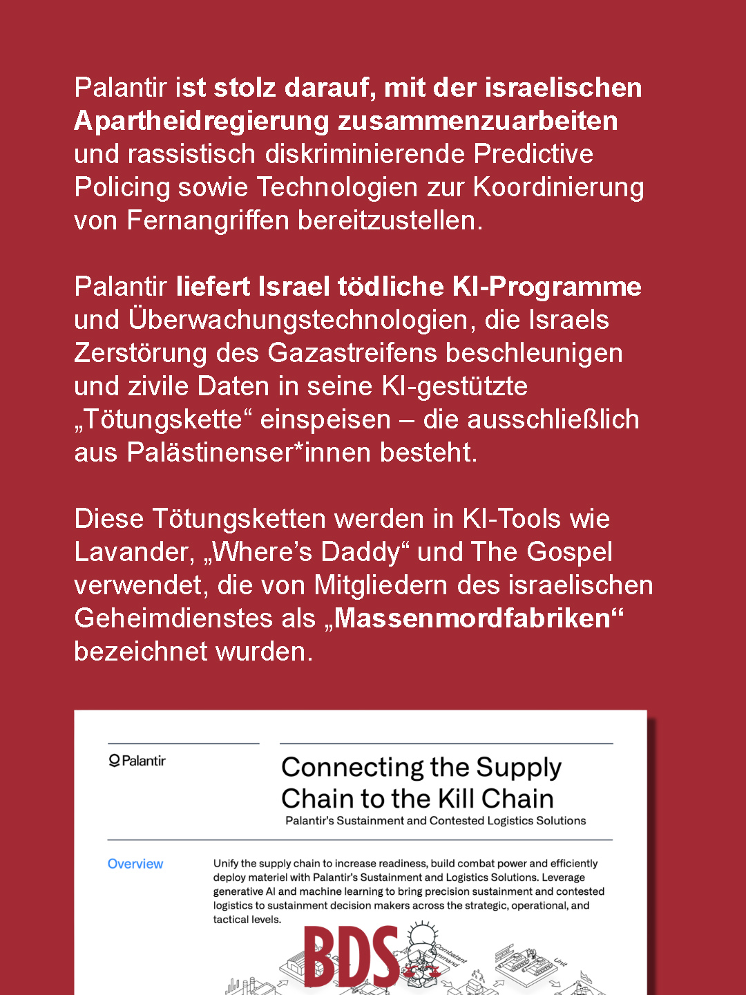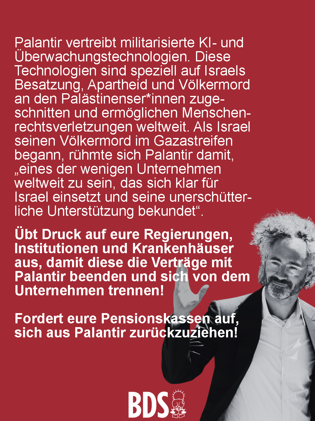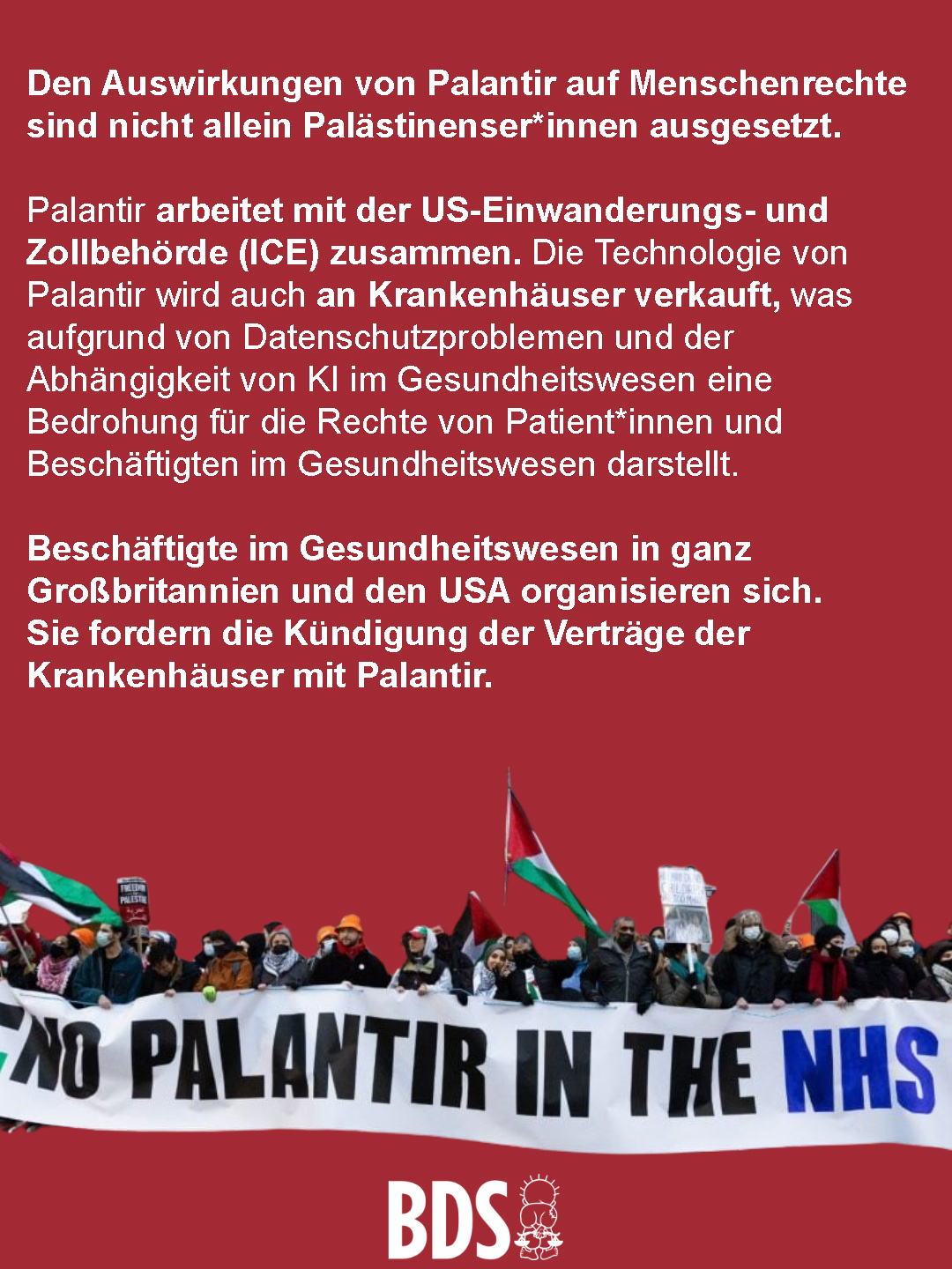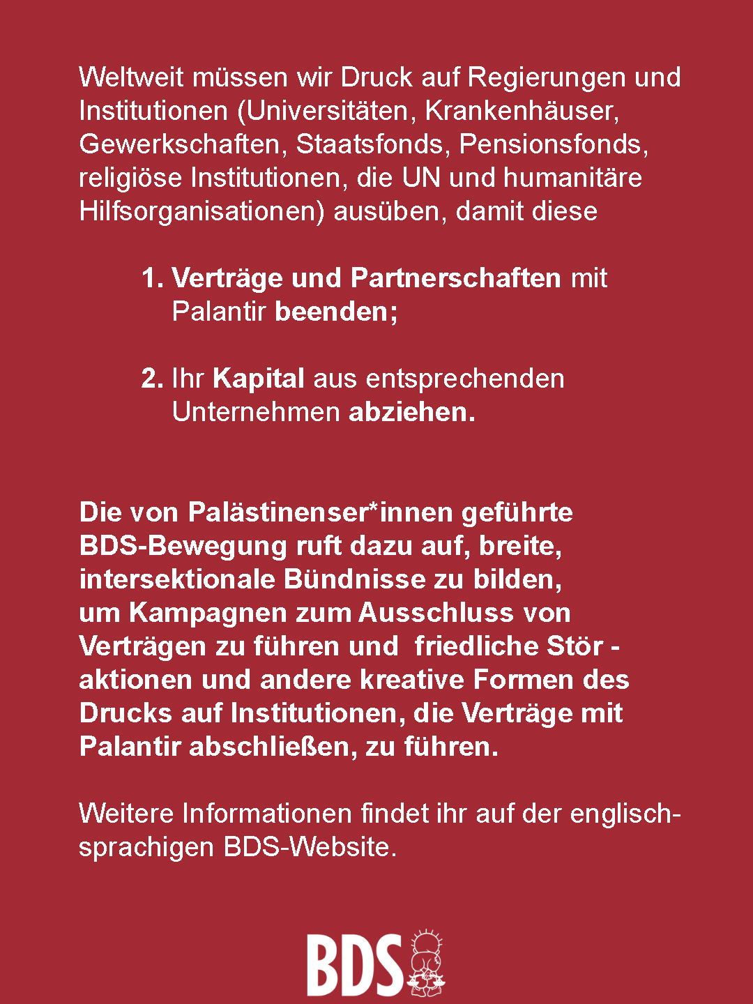 📢Die von Palästinenser*innen geführte BDS-Bewegung ruft dazu auf, breite, intersektionale Bündnisse zu bilden, um Kampagnen zum Ausschluss von Verträgen zu führen und friedliche Störaktionen und andere kreative Formen des Drucks auf Institutionen, die Verträge mit Palantir abschließen, zu führen.